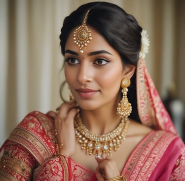Typically, a Telugu bride wears a saree known for its vibrant colors and ornate designs. The traditional Kanchipuram silk sarees are particularly remarkable, representing exquisite craftsmanship and timeless elegance. These sarees often feature intricate gold zari work, showcasing the bride's persona and social status. When draped traditionally, the saree accentuates the curves of the bride, further enhancing her grace and beauty.